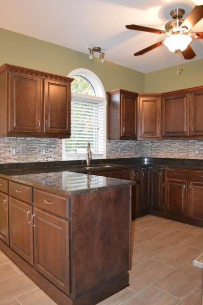 - Custom kitchen with glass tile backsplash, granite counters, stainless steel appliances – gas stove, fridge, dishwasher, microwave
